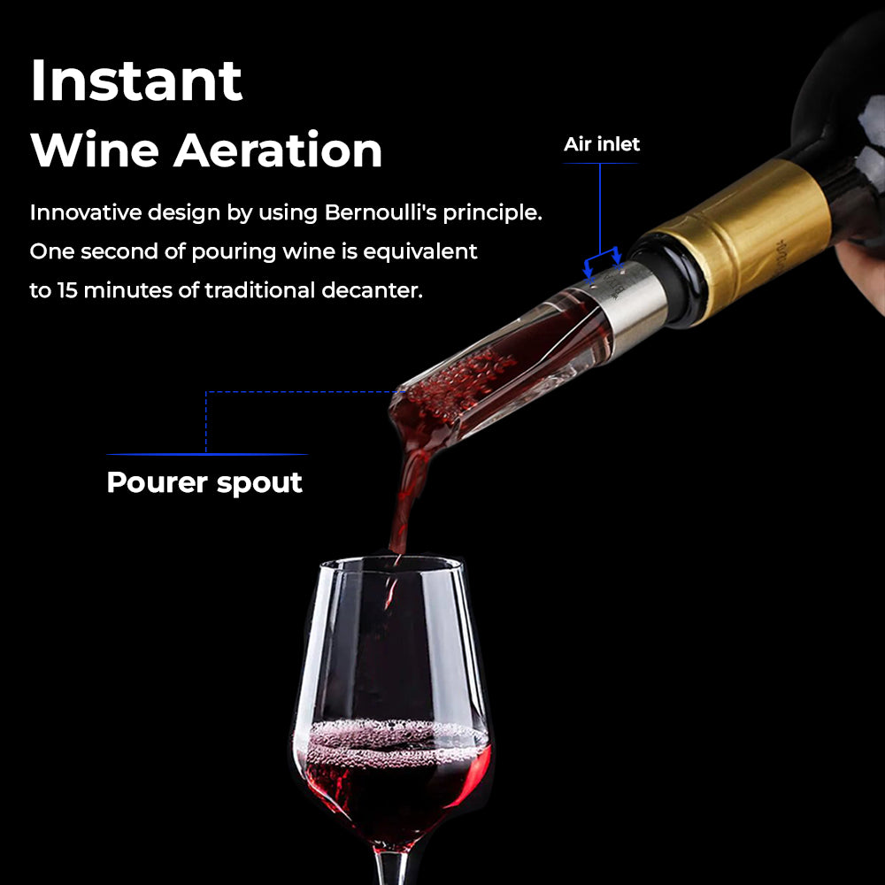 Innovative Design has air intake system that allows the perfect amount of oxygen to mix with wine during pouring enhancing the flavors and aromas of the wine. Bubbles are produced during the aeration process and indicate air was infused into the stream of wine being poured.